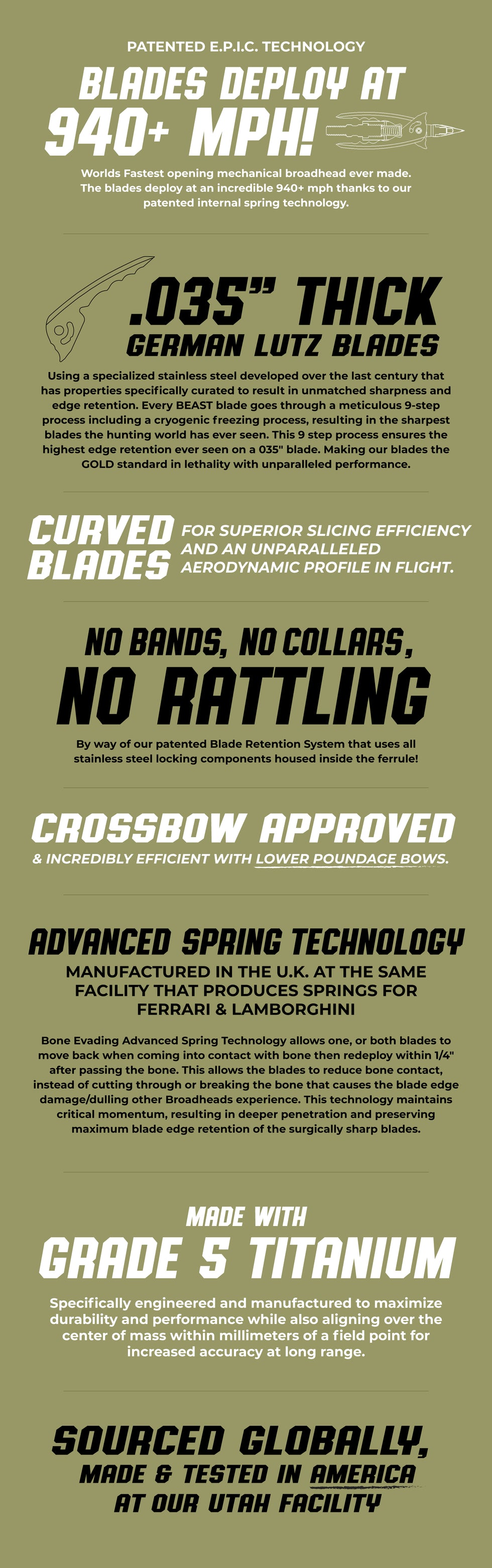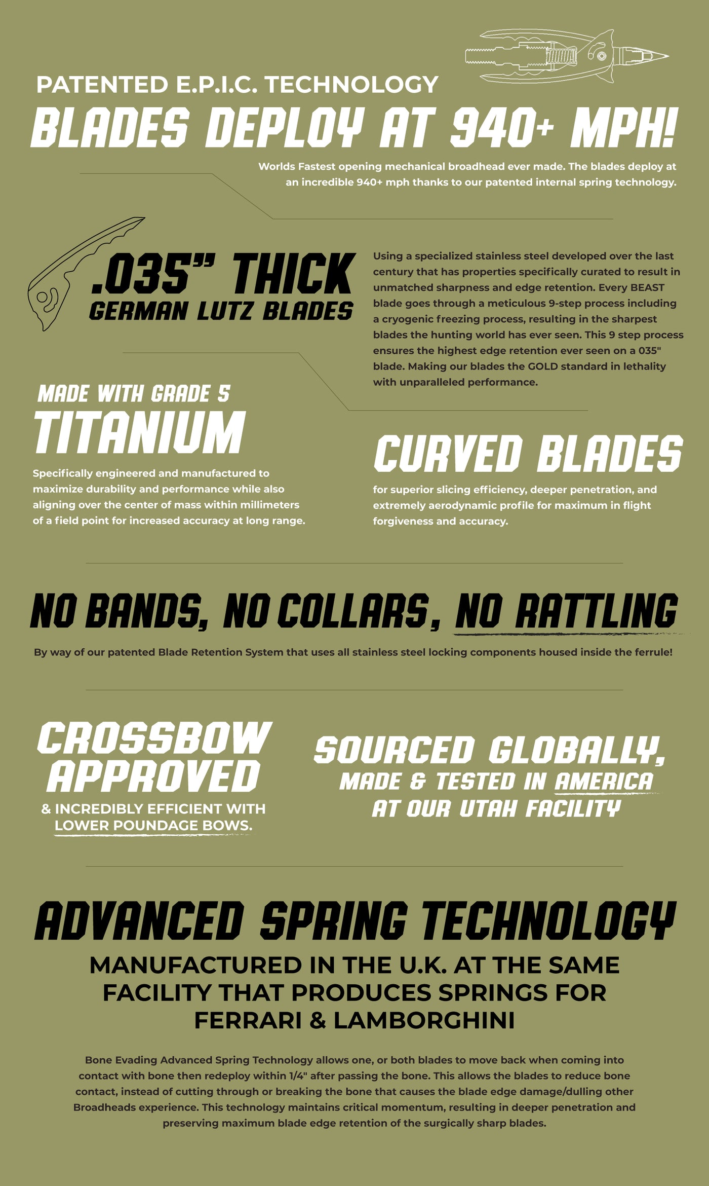 - Bone Evading Advanced Spring Technology (BEAST): Features blades that retract and redeploy when encountering bone, preserving sharpness and kinetic energy for unmatched penetration.